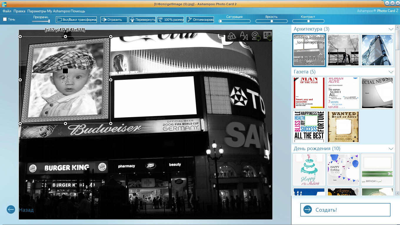 Теперь, если хотите поздравить близких Вам людей, то не надо ломать голову над поиском оригинальной открытки - просто сделайте ее сами. Воспользуйтесь изображением с web-камеры или Вашего компьютера, определите шаблон - открытка практически готова. Предусмотрены шаблоны для Дня Рождения, свабьбы, Нового года, Рождества, Пасхи, а также множество произвольных тематик (дети, архитектура, рамки, лето, коллаж и т.д.), куда Вам надо просто вставить фотографию. Более того, можно использовать несколько шаблонов одновременно, смешивая и комбинируя существующие, тем самым получая совершенно новые объекты.
