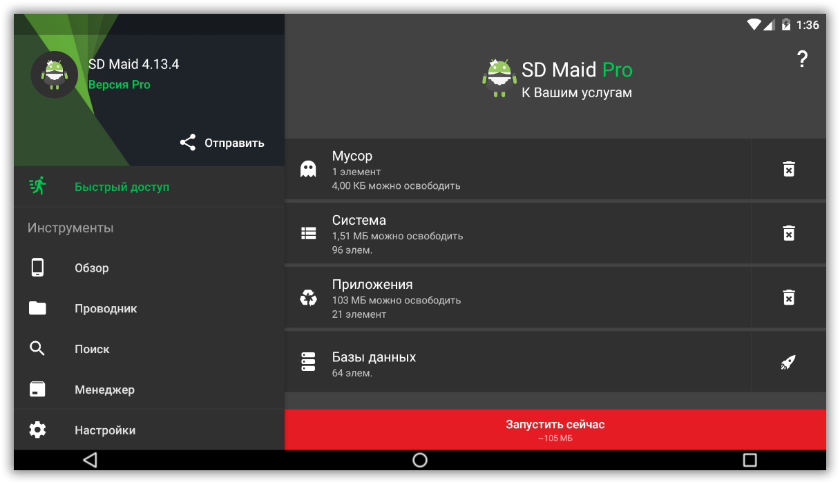 • Мусор - ищет на Вашем устройстве неиспользуемые файлы и сравнивает со списком установленных приложений.