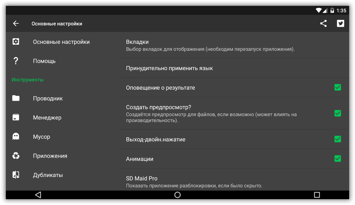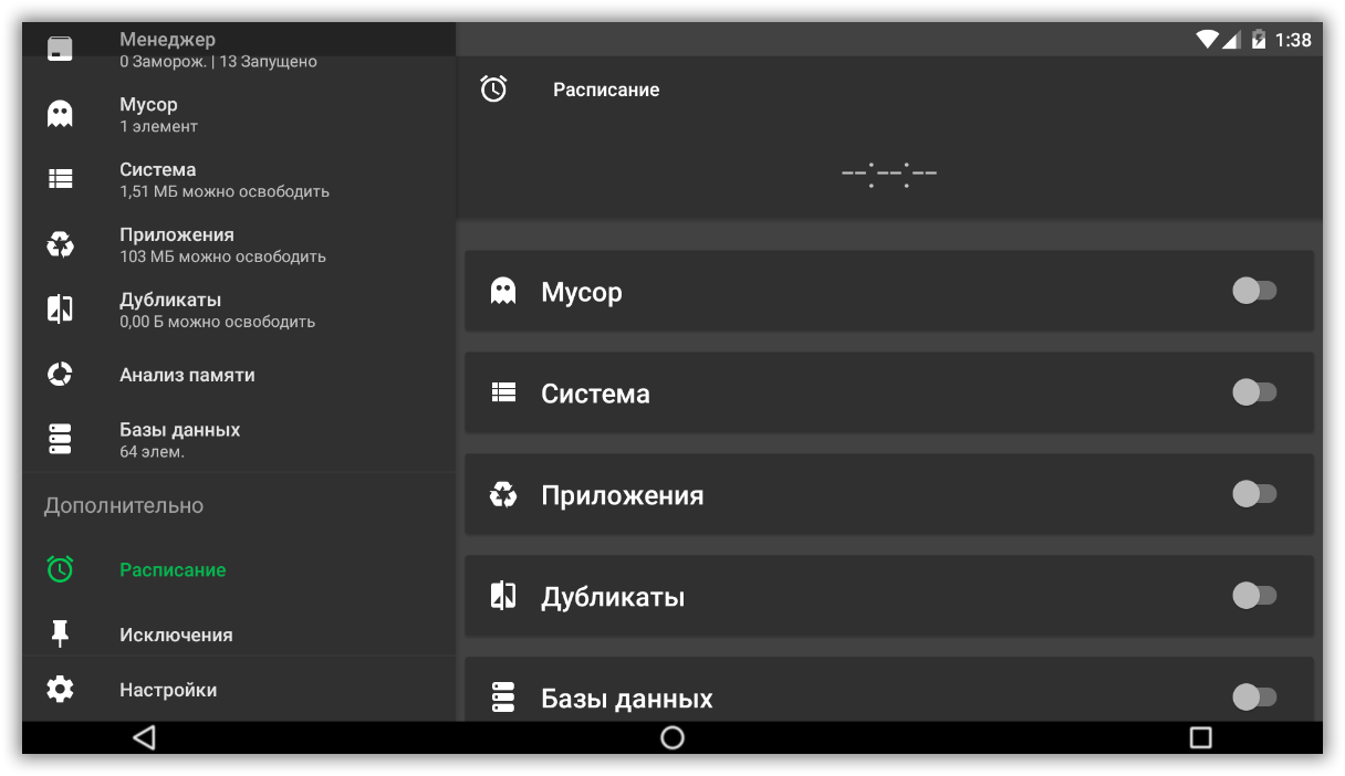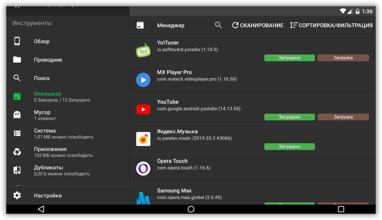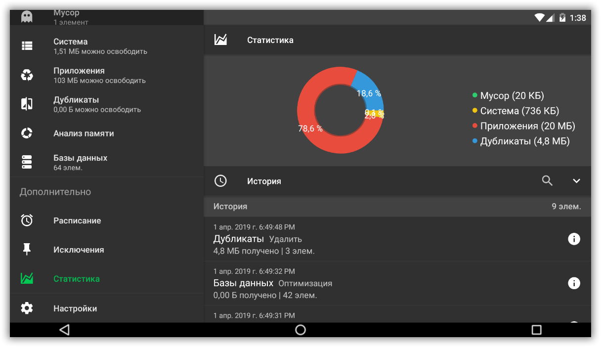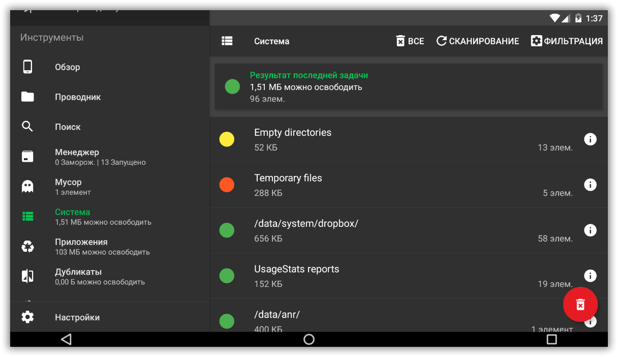 • Мусор - ищет на Вашем устройстве неиспользуемые файлы и сравнивает со списком установленных приложений.