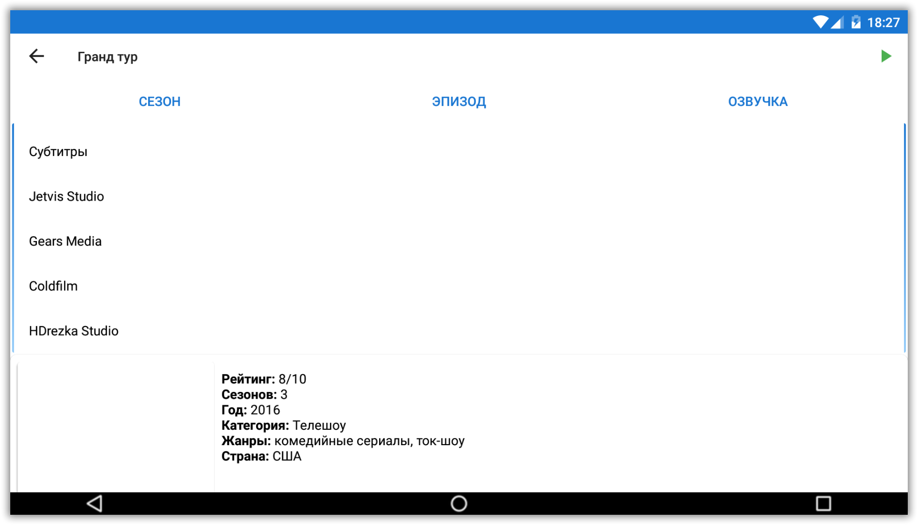 - Удобный выбор содержимого (по умолчанию проигрывается последняя серия сериала).