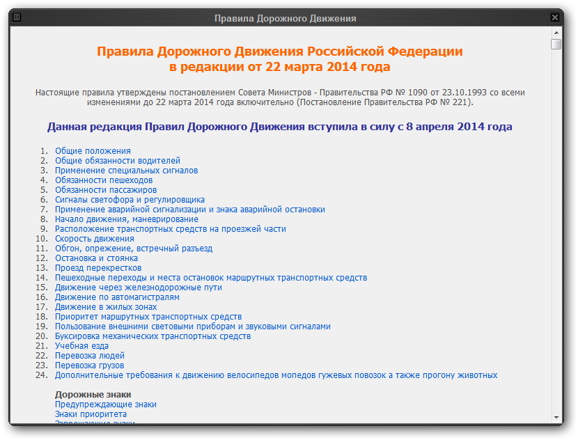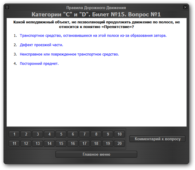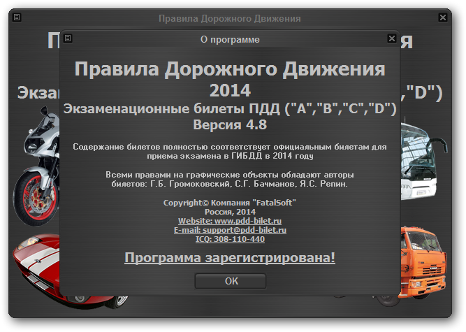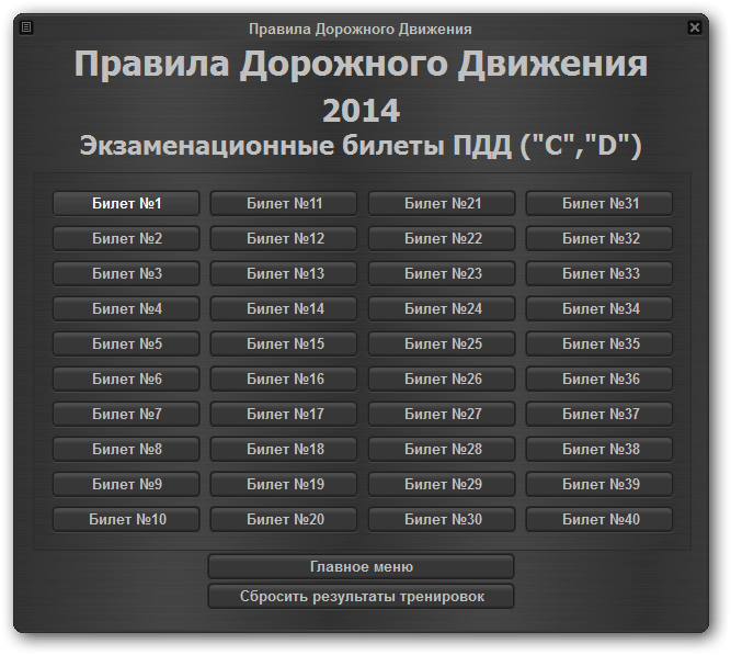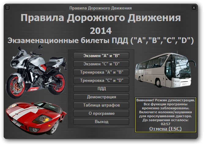 Программа предназначена для подготовки к сдаче теоретического экзамена ПДД в ГИБДД на права категорий "A", "B", "C" и "D". 80 билетов по 20 вопросов. Содержание экзаменационных билетов ПДД 2014 ABCD (в том числе и графические объекты) полностью соответствует официальным билетам ГИБДД.-