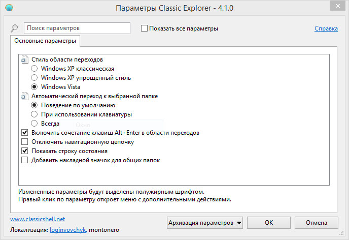 Classic Shell — это утилита, главное предназначение которой заключается в включение классического стиля и оформления меню «Пуск» и проводника Windows 7. Она имеет ряд особенностей интерфейса, которые были удалены из Windows Vista, Windows 7 и 8, и которых нет в новых ОС. Также Classic Shell добавляет в Проводник панель инструментов для выполнения таких операций, как переход в корневой каталог, вырезание, копирование или вставка объекта, отображение свойств папки и др. Хочу заметить, что это не кастомизатор, заменяющий системные файлы, а простая программка. Она имеет массу настроек как для Меню Пуск, так и Проводника с возможность отключать те или иные функции. Она локализация на множество языков, в том числе и на русский. Абсолютно не требовательна к ресурсам.