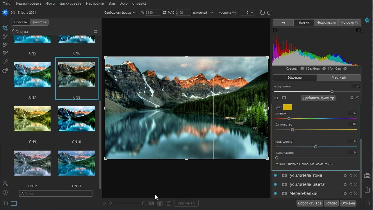 Программа включает самые популярные HDR Look, B & W, Lens Blur (tilt-shift), Glow, Color Enhancer, Tone Enhancer, текстуры, границы, Film Looks, Split Tone и многое другое.