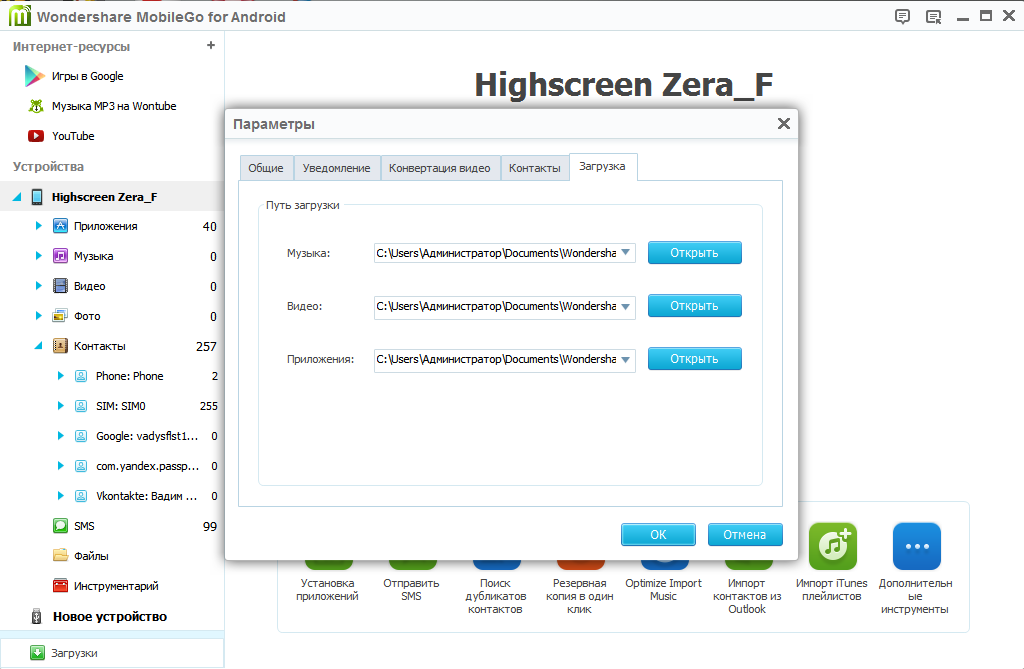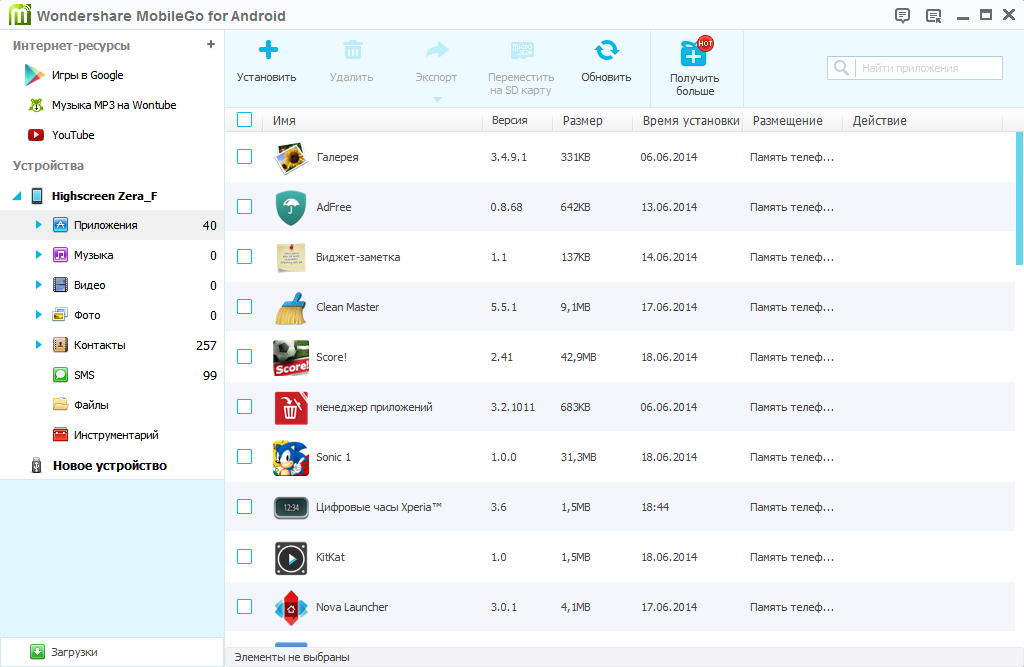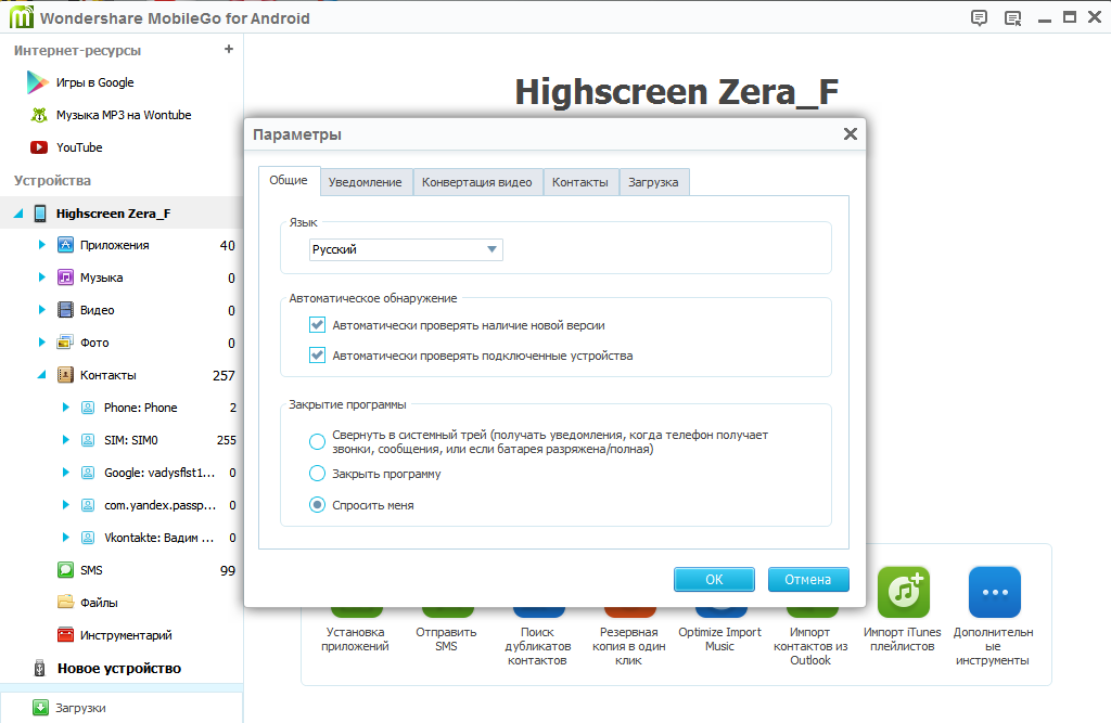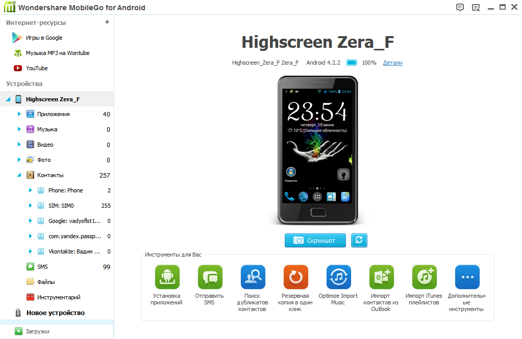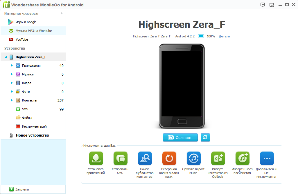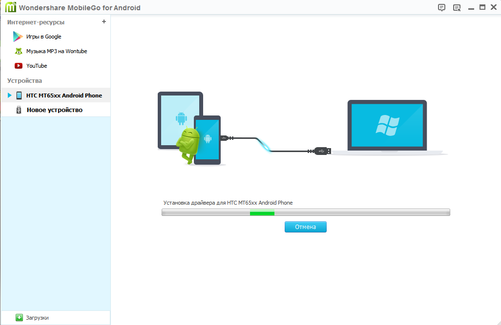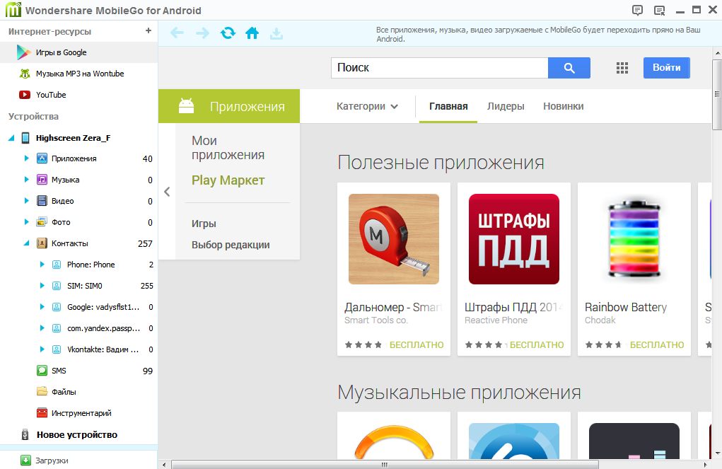 Wondershare MobileGo for Android - это популярный инструмент, ставший уже практически незаменимым для пользователей Android-смартфонов, для управления своими мобильными помощниками при помощи ПК. Приложение работает практически со всем контентом или данными, которыми оперирует смартфон: это, конечно, обязательная синхронизация содержимого по кабелю или через беспроводное соединение, управление контактами, мультимедийным контентом, SMS и MMS сообщениями, конвертация видеофайлов для их дальнейшего просмотра на смартфоне, резервное копирование или восстановление данных.-